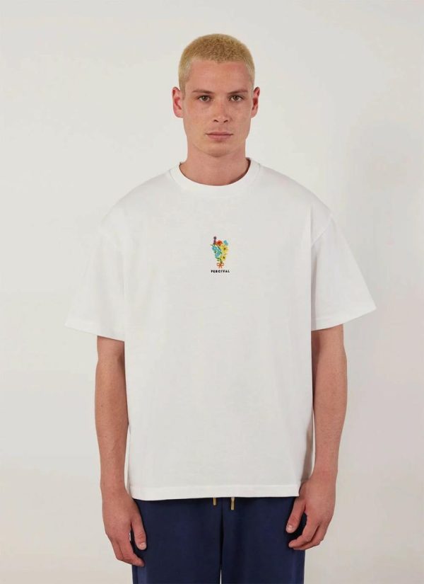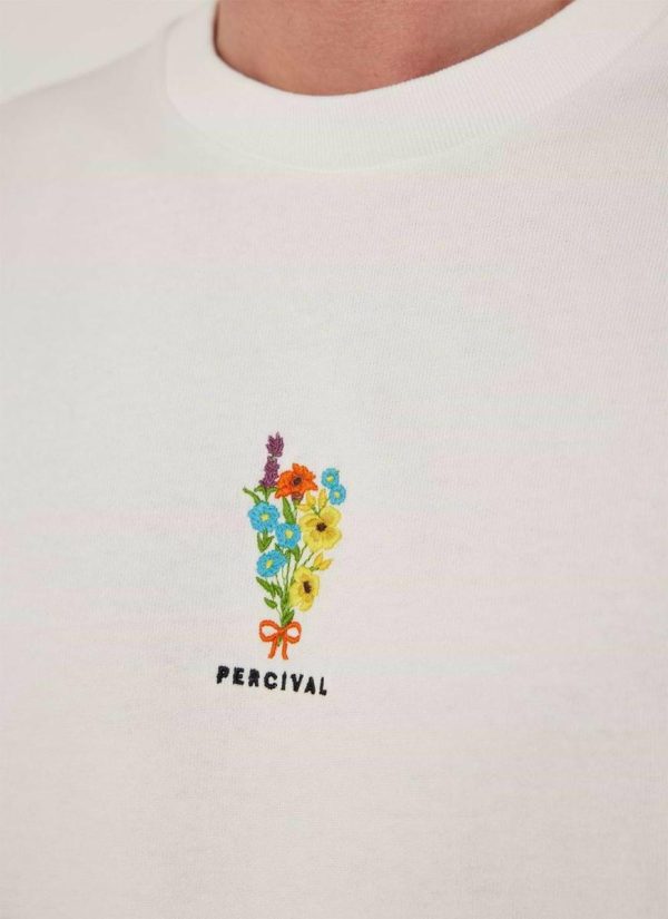 Percival Auxiliary part of the building blocks of every outfit of every day. Heavy weight oversized tee, with embroidered floral arrangement. Flowers for me? I already have one of these tees, the are great, but these flowers are for you. Lucky you. Lucky clover? No flowers.