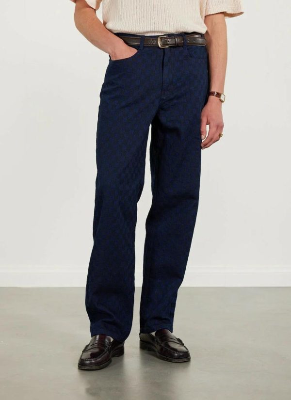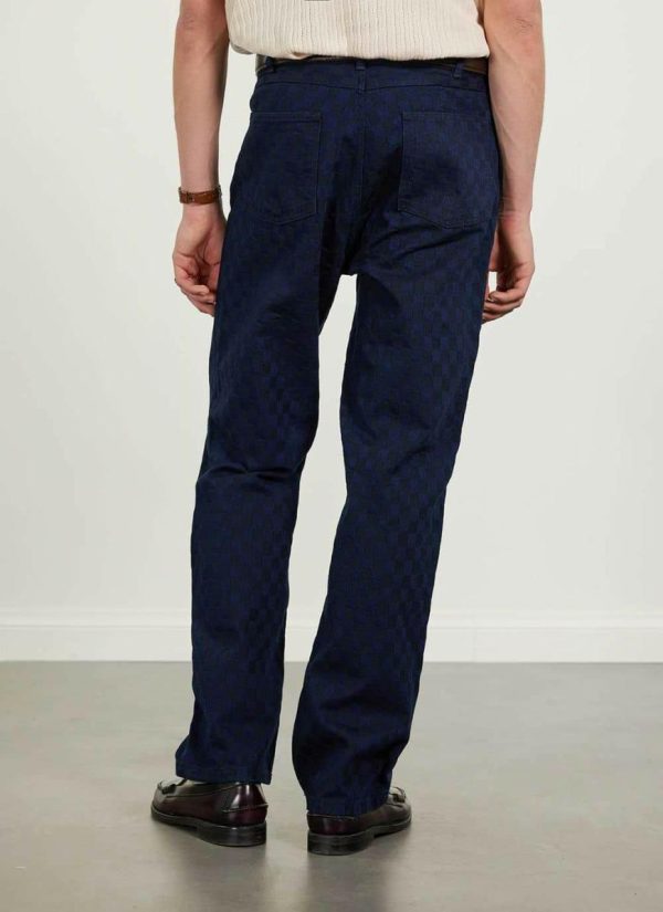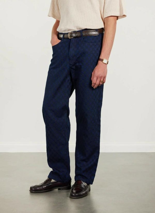- Features: Men’s checkerboard trousers crafted from premium Japanese denim. Featuring a leather engraved back patch, these straight leg trousers are ideal for everyday wear.