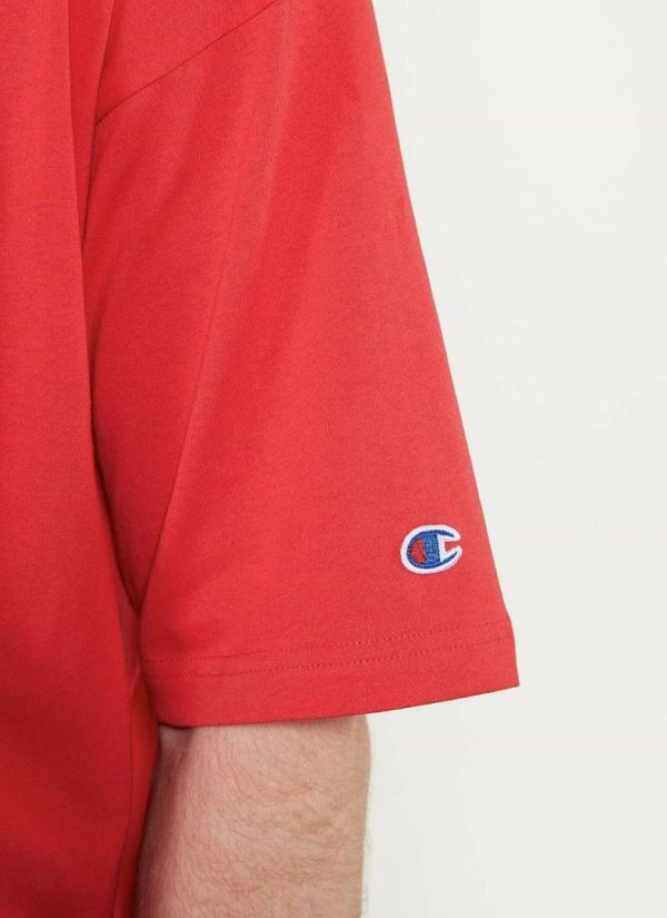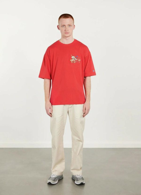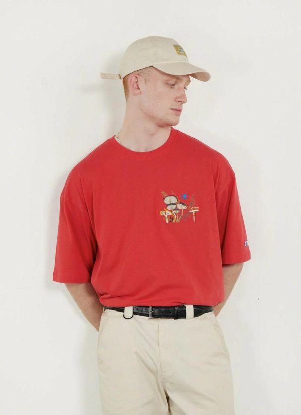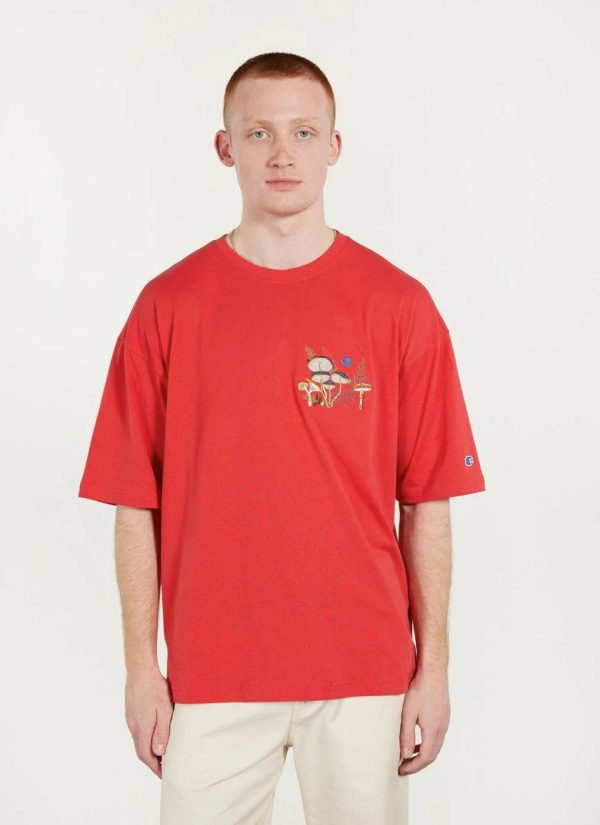 - Features: Men’s short sleeve t shirt with fungus pals and Champion embroidery. Embroidered by Percival in London on a 180 gsm premium cotton, this red champion t shirt is ideal for warm weather and an easy-to-wear staple.
