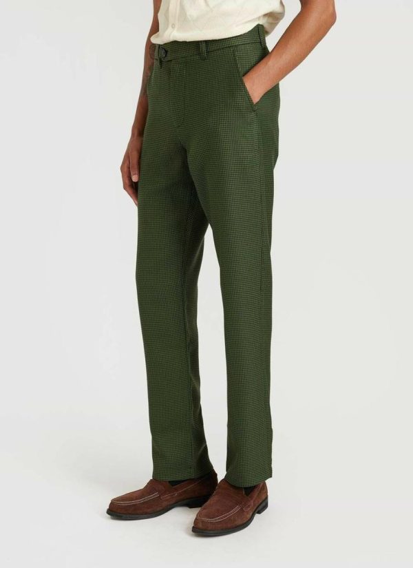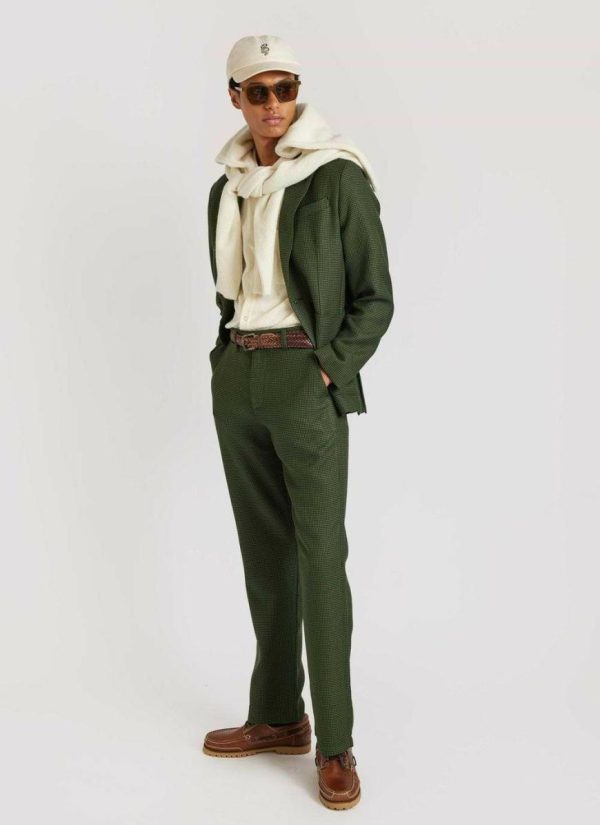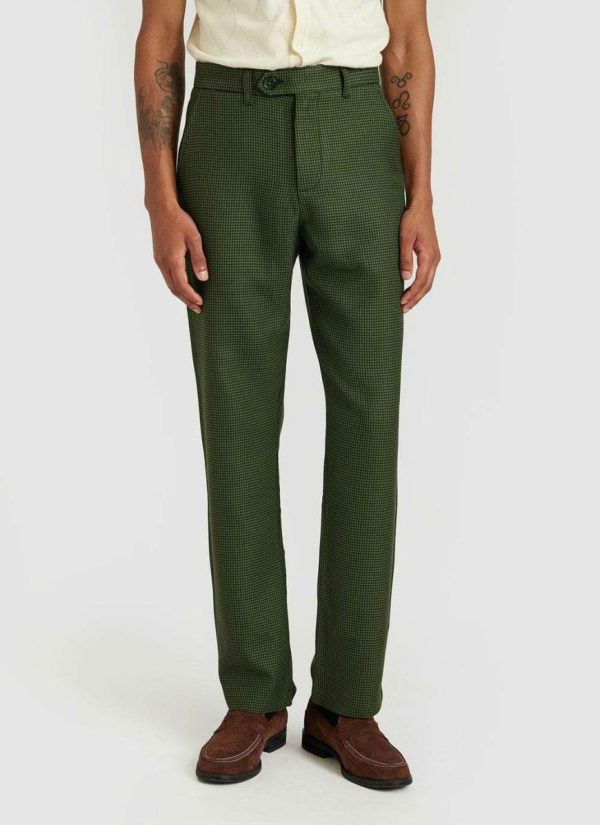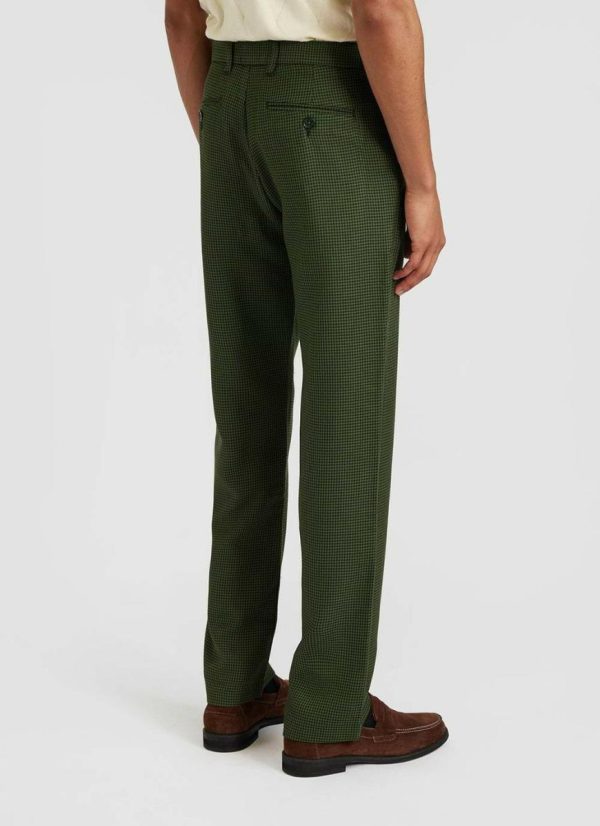- Features: Men’s Houndstooth Tailored Trousers made from a custom dyed wool blend fabric. Finished with tonal corozo buttons, inside pockets and belt loops, these straight leg trousers are ideal for weddings and smart dressing.