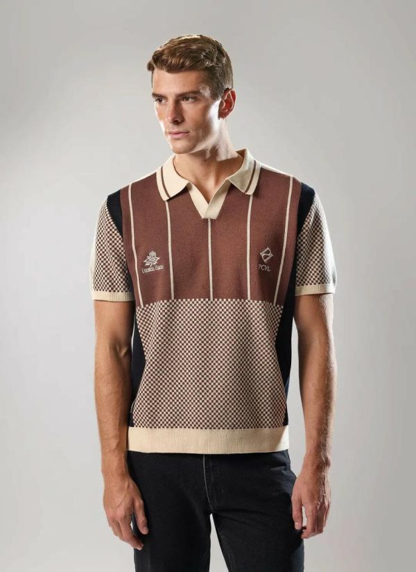 - Features: Men’s knitted shirt with short sleeves. Finished with embroidery on chest, open placket and stripes, this Umbro x PCVL brown knit shirt is ideal for those who want to be the best dressed in the room without breaking a sweat. Limited edition.