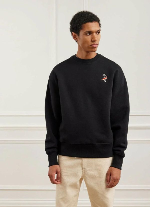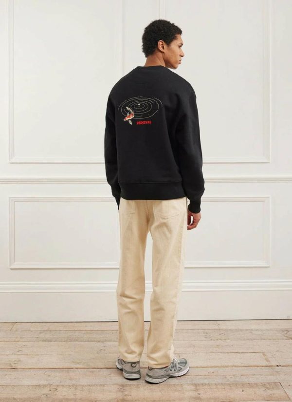 Exploring the wilderness never looked so good. Percival Not Suitable for Camping collection. Part of the outdoors – fish. Koi fish. The oldest Koi Fish was 226 years old, sounds like some solid blue zones, blue water, being in water is nice and relaxing but would rather be nice and warm in winter in a heavy weight organic cotton sweatshirt. Hand illustrated in our London studio then interpreted as a deluxe koi fish embroidery. Nice.