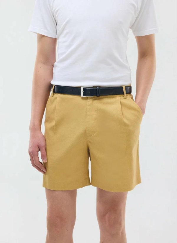 - Features: Men’s pleated shorts made from 100% linen. In a tailored fit with a fixed waistband, front pleat details, a wide width and length that finishes above the knee, and back welt pockets, these green linen shorts are ideal for spring and summer months.