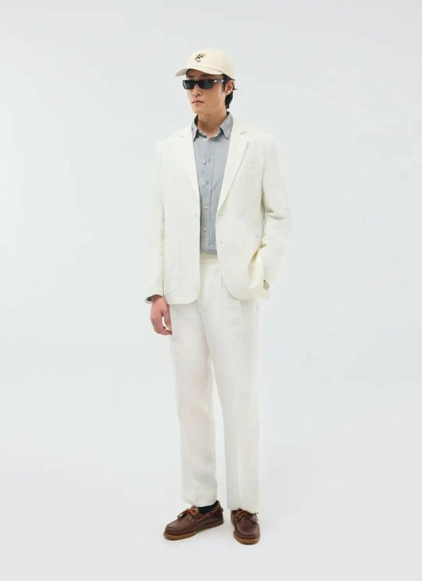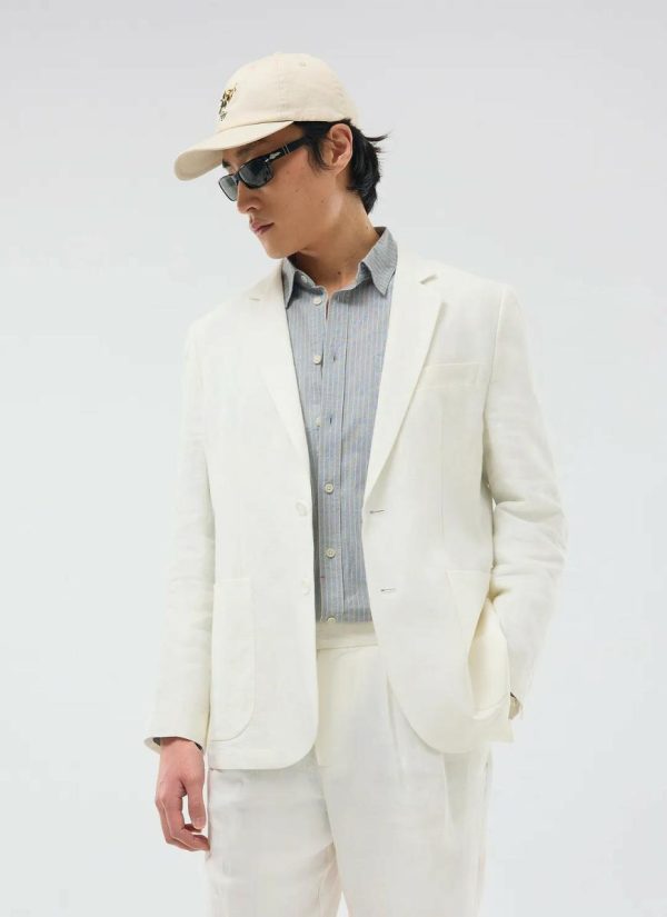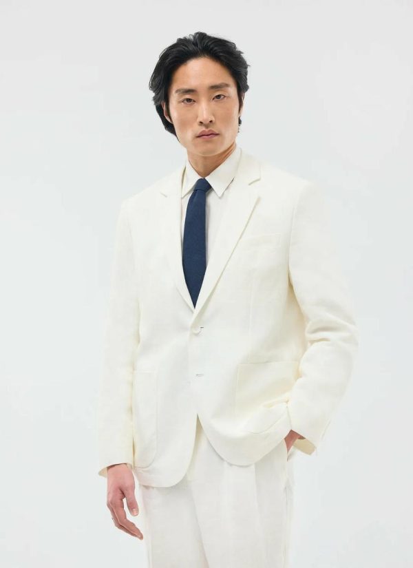 - Features: Men’s Linen Blazer in White, made from a lightweight 100% Linen fabric in a pure white colourway. Our White Linen Suit Jacket is made with increased body and sleeve widths for comfort and thin shoulder pads for a structured shape. The White Relaxed Blazer is finished with back vents, chest welt pockets, side patch pockets and button-fastening. This lightweight Linen Suit Jacket is ideal for Weddings & Smart Dressing all year round.