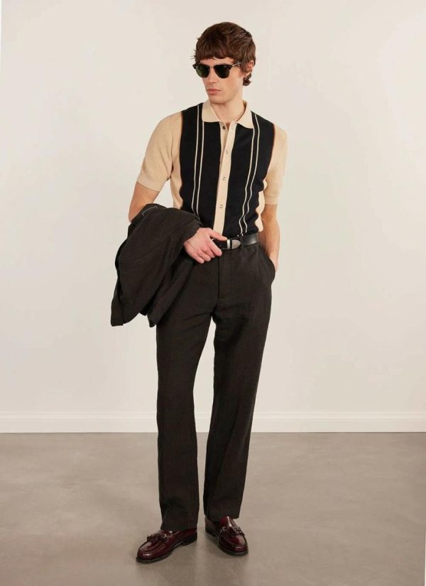 This the striped knitted shirt come polo for the polo, maybe, maybe not. Knitted in a quality cotton, nice standard fit but not standard, it’s a special piece. Style with linen pleated trouser or short, dark sunglasses, attitude.