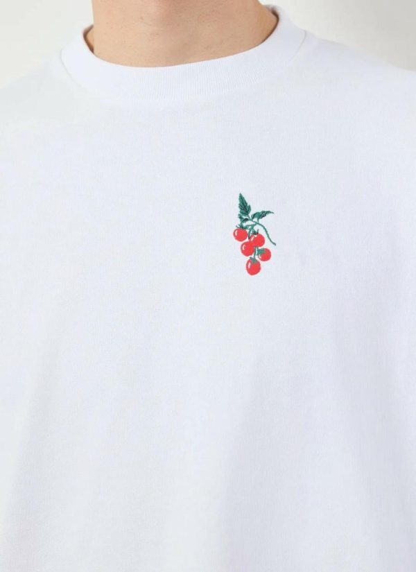 Percival Spring Summer 2025, full flavour, full Perci pomodoro. Vibrant colours, rich silhouettes, all wrapped up for lucky customers. Tomato tee, hand illustrated illustration with embroidery at chest and print on back, molto bene.